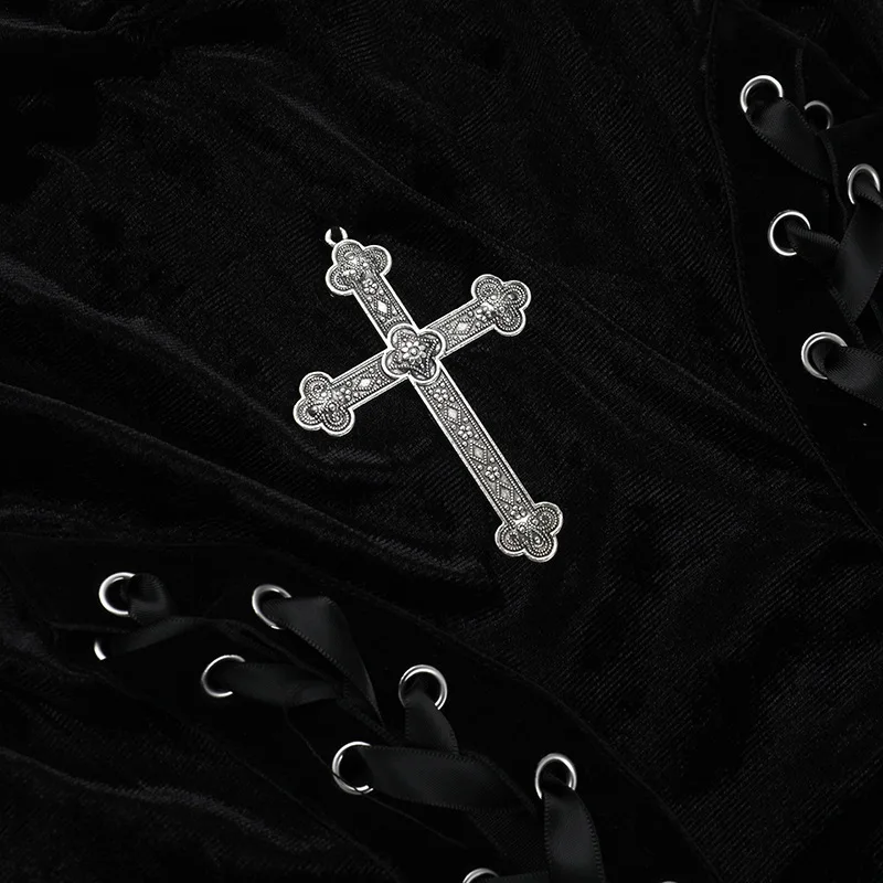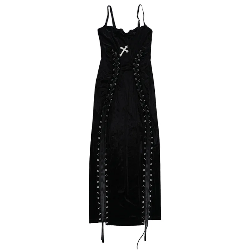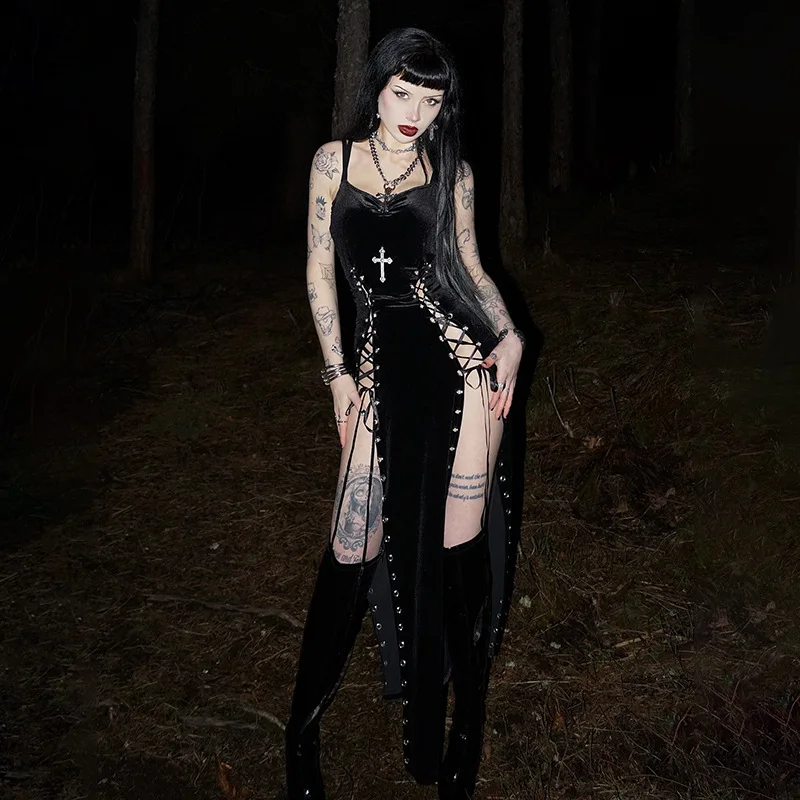 Gothic Black Strappy High Slit Velvet Suspender Maxi Sexy Slim Party Club with New Goth Aesthetic 9Os Style Oem Odm